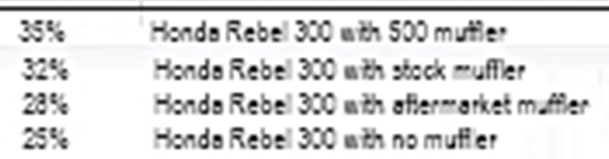 35% Rebel 300 with 500 muffler…… 32% Rebel 300 with stock muffler . 28% Rebel 300 with aftermarket muffler 25% Rebel 300 with no muffler