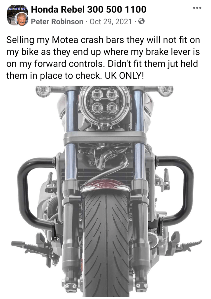 • Motea crash bars do not fit Rebel 500 with forward controls (see below,)