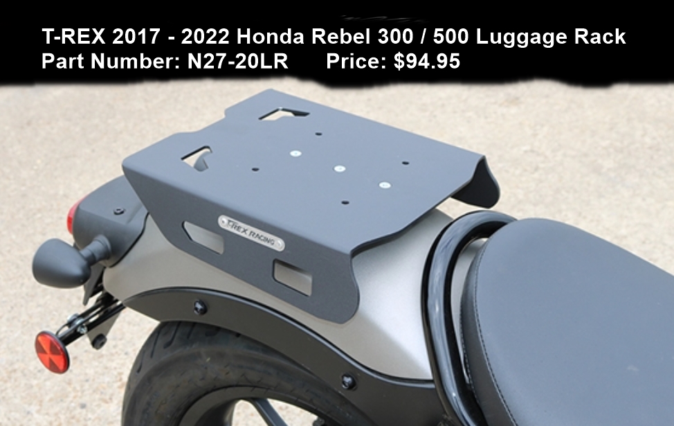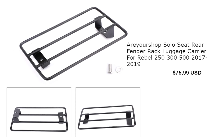Areyourshop Solo Seat Rear Fender Rack Luggage Carrier For Rebel 250 300 500 2017-2019 (U.S.) https://www.amazon.com/dp/B07S7Q213K/ref=cm_sw_r_cp_api_i_w6xGEb1P3DEZE