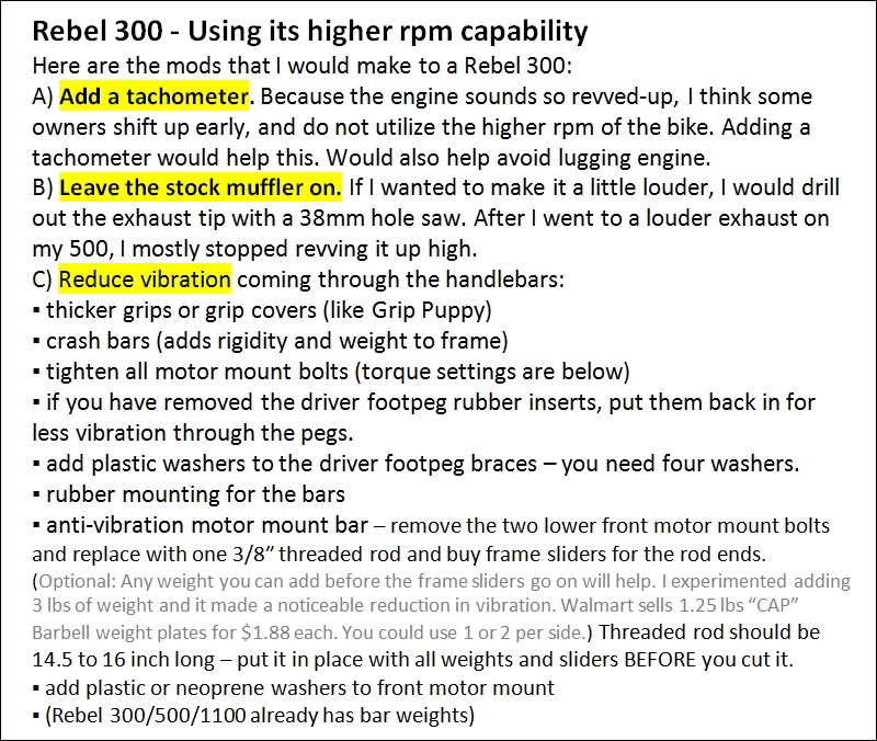 B) For drilling the stock muffler, please see this page: https://rebel500.com/rebel-500_stock-muffler-mods/