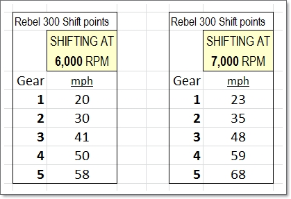 [Rebel 300 shift points] ….. Here is mph at 5,000 rpm in each gear: 1) 17 2) 25 3) 34 4) 42 5) 48 6) 54 If you tape this near your speedometer, you will know about when to shift – example: in 3rd at 34 mph your are hitting 5,000 rpm, so you can shift up to 4th. Then, in 4th at 42 mph your are hitting 5,000 rpm, so you can shift up to 5th.
