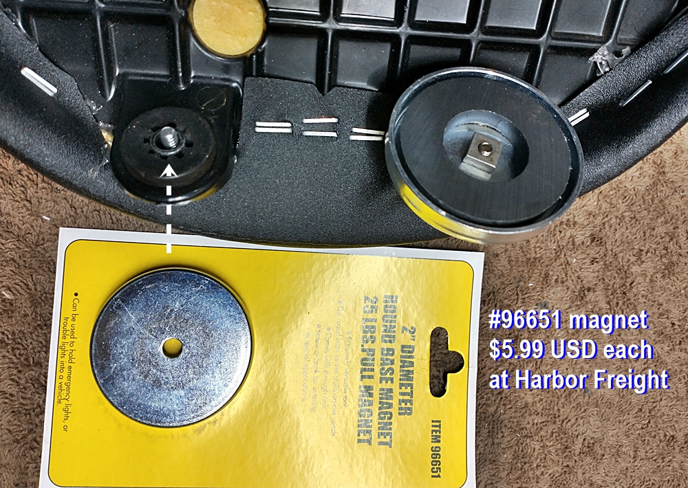 Parts needed: •two #96651 magnets (2 inch diameter round base magnet 25 lbs pull magnet) $5.99 USD each at Harbor Freight •two M6 .75″ or 19 mm long bolts (18-20 mm is OK) •two M6 nuts