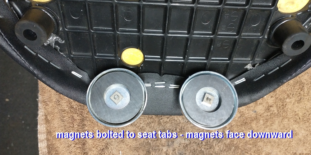 Installation: Remove seat, attach magnets (with magnet facing downward) with M6 bolts. Re-install seat, making sure that front tab goes in properly – you should not be able to lift the seat in front. The magnets will hold the seat in back – make sure the seat is as far forward as it will go. To remove seat, lift the rear of seat firmly.