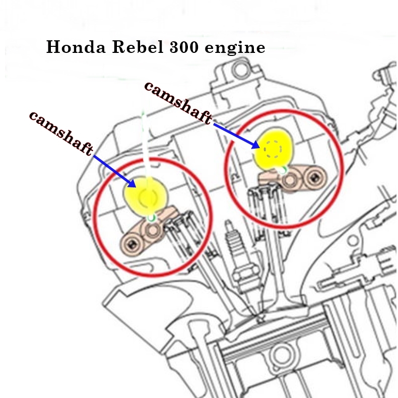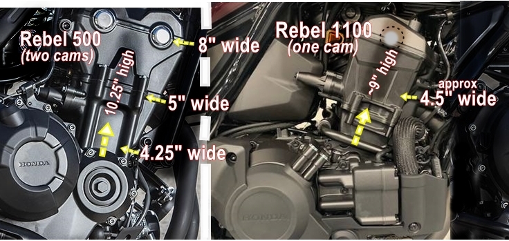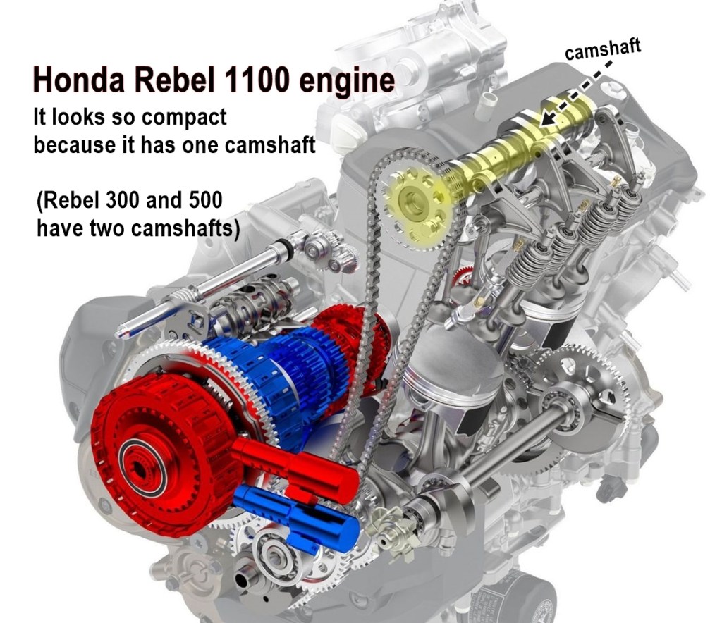 The Rebel 1100 cylinder head looks so compact because it has one camshaft. The Rebel 300 and 500 have two camshafts.