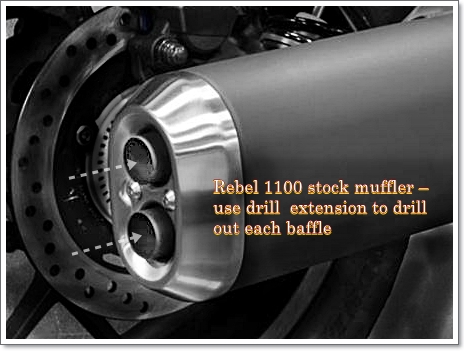 The Rebel 1100 stock muffler has two muffler sections – you can drill out each baffle with a drill extension. Start with a 1/2 inch hole. If it is not loud enough, use a larger drill bit.