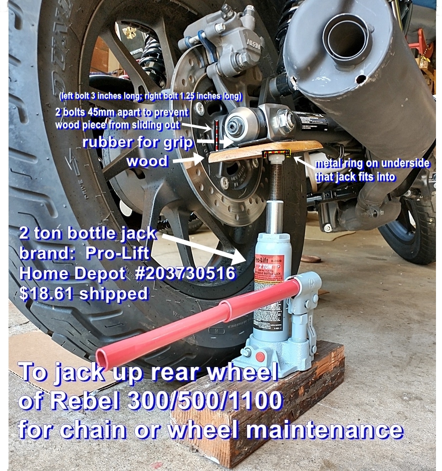 Maintenance – ..Bottle Jack Using a bottle jack with Rebel 300 / 500 First, activate the steering lock. Raise rear wheel only about 1/4 inch – just enough to spin the wheel so you can lube the chain. Wood piece to put between the bike frame and the jack.