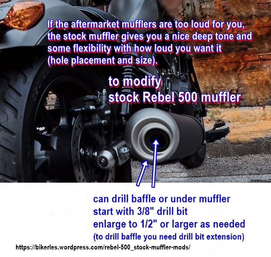 I like a bike to be just a little louder than stock (maybe 20%). I drive through a lot of neighborhoods, and with loud pipes I have to drive like a grandma. With quieter mufflers, I can rev it up more. …… …… I’m pretty sure that any aftermarket muffler would be louder than the stock muffler with holes drilled. If the aftermarket mufflers are too loud for you, the stock muffler gives you a nice deep tone and some flexibility with how loud you want it (hole placement and size). You can drill out the baffle with a drill extension, or drill a hole underneath the muffler. Start with a 3/8 inch hole. If it is not loud enough, enlarge it to 1/2 inch or larger.