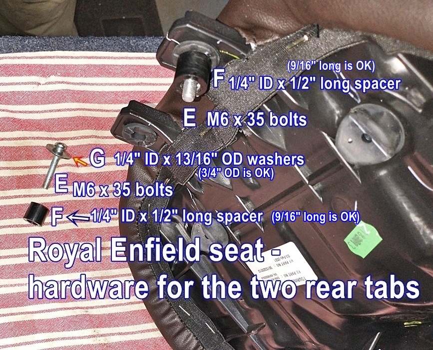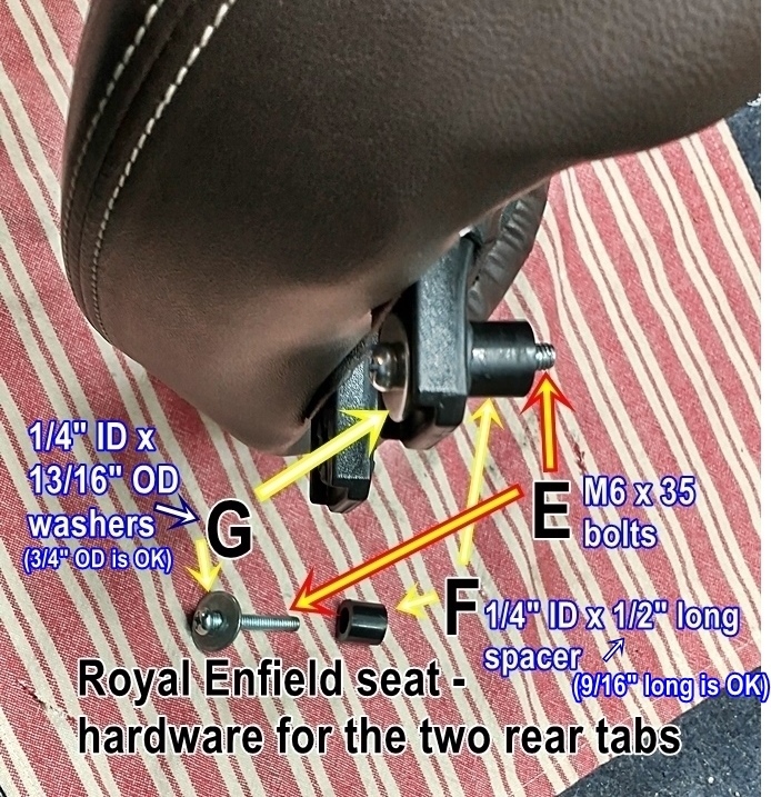 step 4) Attach E, F, and G to rear seat tabs as shown below. It helps to put tape inside the spacers “F” so they don’t fall off while you are attaching the seat.