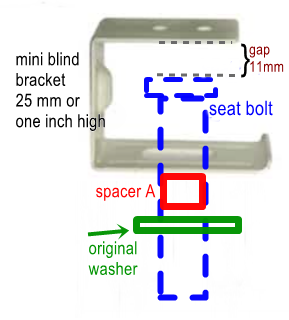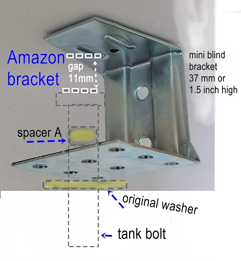 3)..Amazon: Low Profile Center Support Bracket for Blinds – 2 Pack $6.79 USD https://www.amazon.com/dp/B00JMN581C/ref=cm_sw_r_awdo_DZWSNNVC25B0M6KS62YK (height is 1.5″ but it will still work. You will be using it upside down, so the widest part of the bracket faces down.) Installation order: gas tank bolt, spacer A, U bracket, original washer.