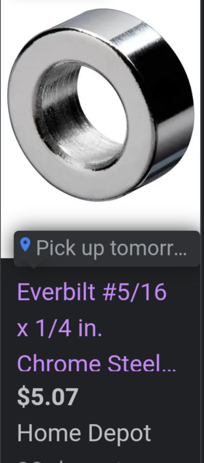 part A) Home Depot: Model #800284/ SKU #368989 / spacer 5/16″ (8mm) x 1/4″ (6mm) / two for $5.07 USD / spacer is 1/4″ (6 mm) long, hole is 5/16″ (8 mm)