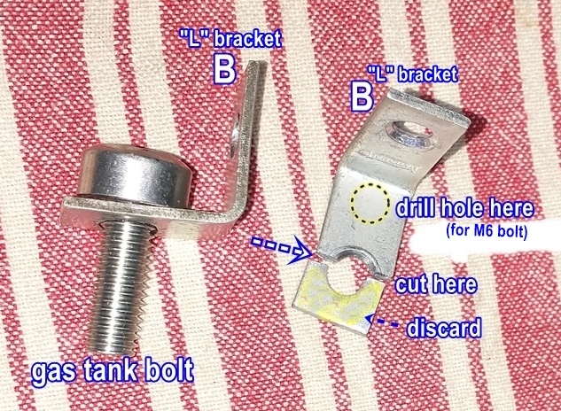 step 3) Put the gas tank bolt into the other (uncut) “L” bracket and invert the cut “L” bracket and bolt as shown.