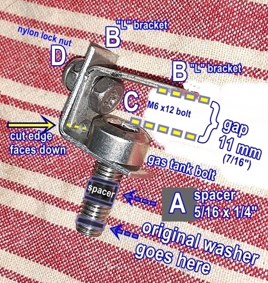 Mounting for the front of seat – For the stock M8 gas tank bolt, you need (A) one 5/16″ (8mm) x 1/4″ (6mm) spacer, (B) two “L” brackets, (C) one M6x12 bolt, and (D) one M6 nylon locking nut.