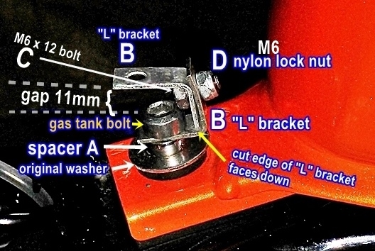 step 4) Add Spacer A and the original washer onto gas tank bolt and install. Tighten the gas tank bolt FIRST and then rotate the cut L bracket into place and tighten the M6 bolt.