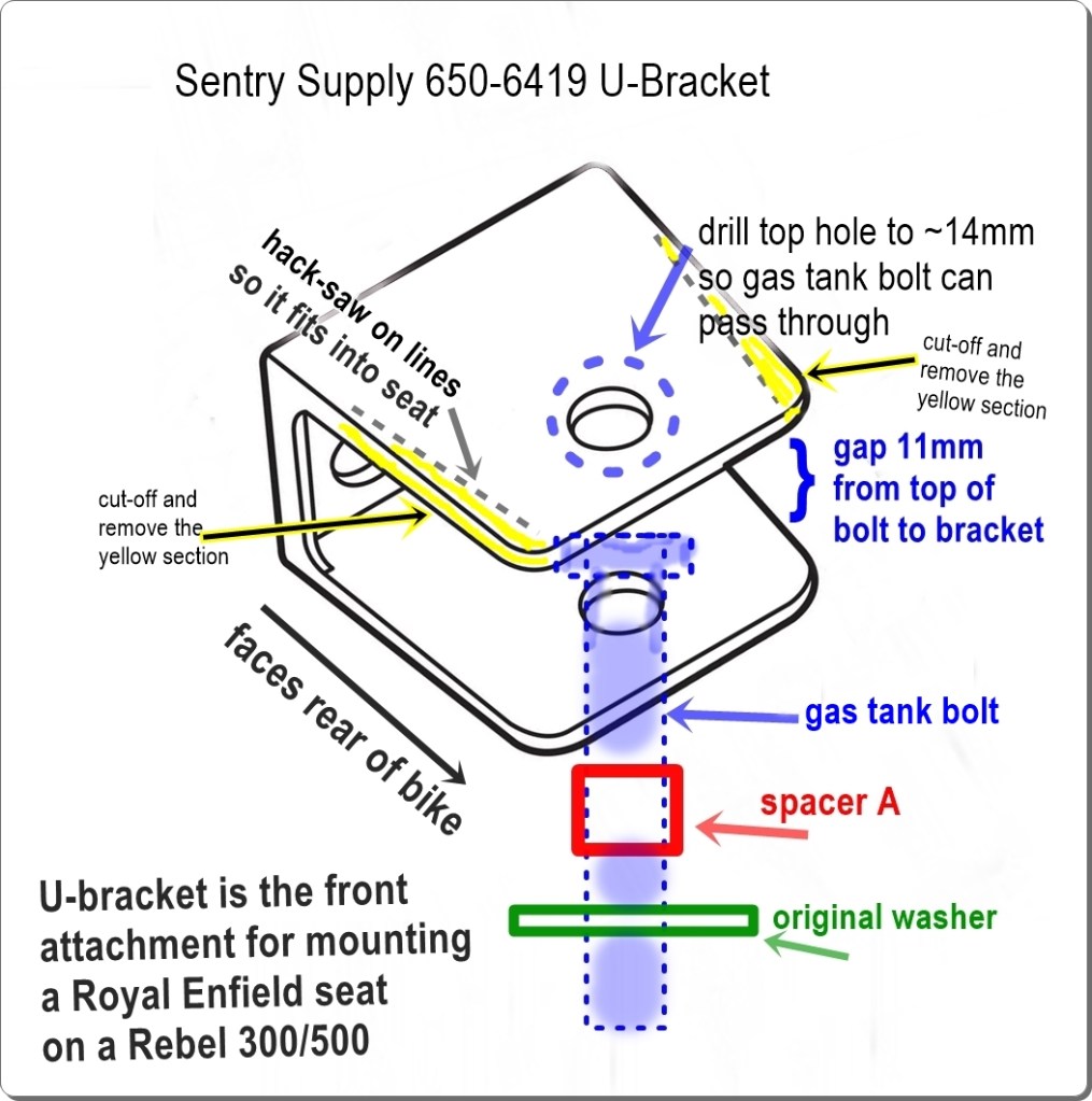 See above – you have to hacksaw the bracket and remove the cutoff pieces highlighted in yellow. The bracket is thick so that makes it harder. Or, if you have a grinder, you could grind it off – it doesn’t have to be perfect. Then you have to drill out the hole(s) so the gas tank bolt fits. … This is the most difficult part of installing the Royal Enfield seat.