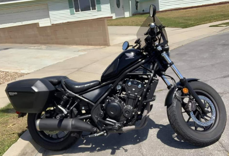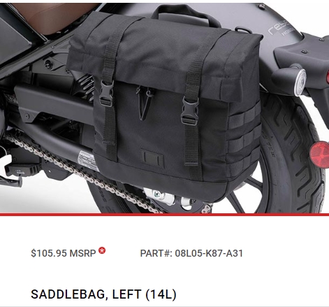 • Honda OEM saddlebags -will fit without modification. Link for Honda saddlebags: https://powersports.honda.com/…/rebel-500/accessories. Note on the Honda OEM Nylon saddlebags: The left bag is bigger than the right bag, due to the exhaust. The right hand smaller bag WILL NOT FIT the left side bracket (due to the locking system)