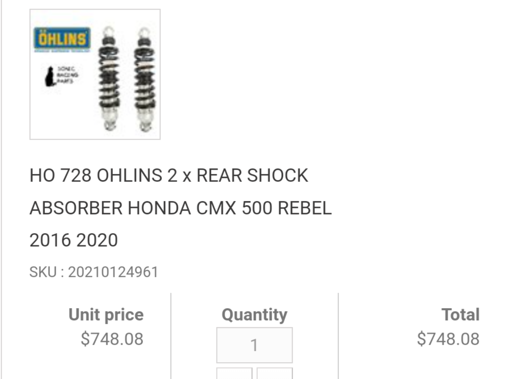 •Ohlins shocks – check out this post in the Rebel forum: https://www.hondarebel3forum.com/threads/update-ohlins-front-and-rear-suspension-now-installed.12203/
