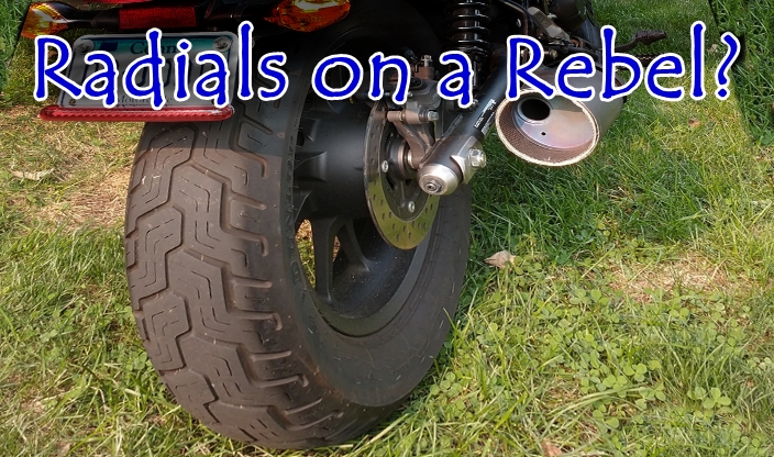 Update2: now that I have gone 200 miles with the low profile radials on my Rebel 500, I am getting more confident and going a little faster in corners. In on-road use, radials are superior in most (not all) ways to bias ply tires – ride quality, handling, smoothness, wet weather traction, resistance to ruts/grooves/seams in the pavement, and less rolling resistance. The radials are not effected by tar strips unless you hit them when you are leaned into a curve. US cars switched to radials in 1982 – why don’t more motorcycles come with radials? If you ever get radial tires, drive below 20 mph and go straight to an empty lot and practice figure-8’s and turning. You are re-learning how to ride your motorcycle.