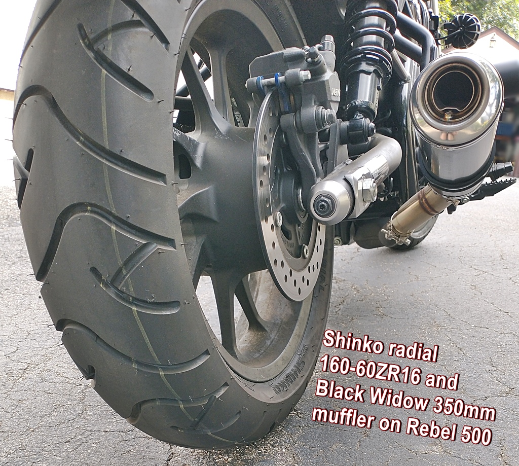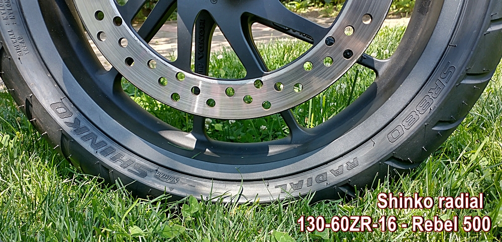 With Shinko radials my Rebel 500 feels lighter and more flickable – more like a sports bike than a cruiser. These radials are possibly the ultimate performance tire – improved ride quality, handling, smoothness, wet weather traction, resistance to ruts/grooves/seams in the pavement, and less rolling resistance (6% better gas mileage). The radials are not effected by tar strips unless you hit them when you are leaned into a curve (on a hot day, tires not broken-in). Six pounds less weight (unsprung weight!) and it lowers the bike 32mm or 1.25 inches. You need one tooth larger front sprocket. You need to drive under 20 mph until you can go to to an empty parking lot and adjust to the dramatic handling change. Since these are lower profile, it changes the angle of the bike when on the side stand. You will need to grind the foot of the side stand, plus do the EZ Fork Mod if your forks are sagging. After changing to 16T front sprocket, speedometer error is 1.7% – 60 mph indicated is 59 mph GPS.