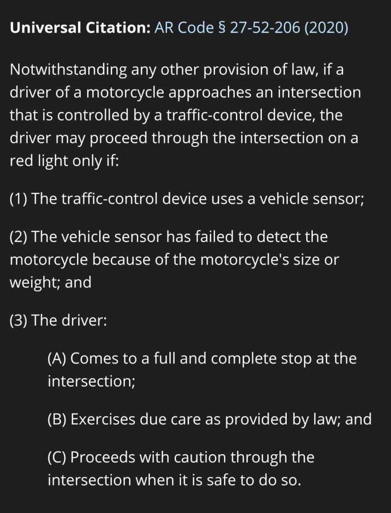 •Arkansas – If the light has a vehicle sensor, and it fails to detect your motorcycle, you can go. You must have come to a full and complete stop. You must exercise due care. Proceed with caution when it is safe to do so.