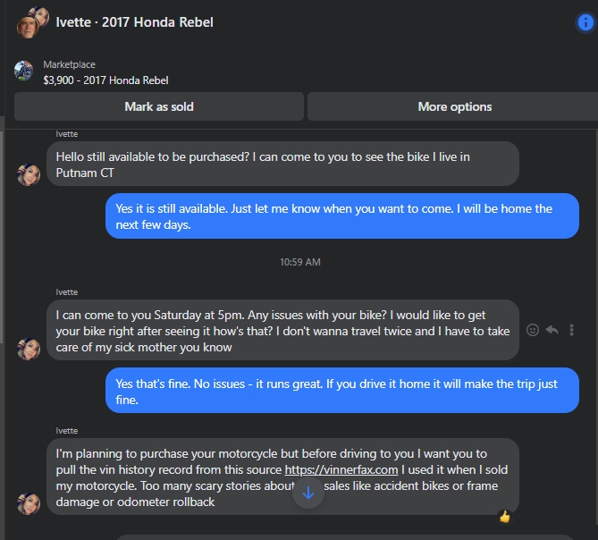 Dec 2022 – I was just targeted in a vehicle history report scam. I have a motorcycle for sale and a person was very interested in buying it, but first wanted me to get a VIN report from vinnerfax.com, which costs $24.00 USD. The way the scam works is they get you to pay for the VIN report, but then do not contact you again about the vehicle you are selling.
